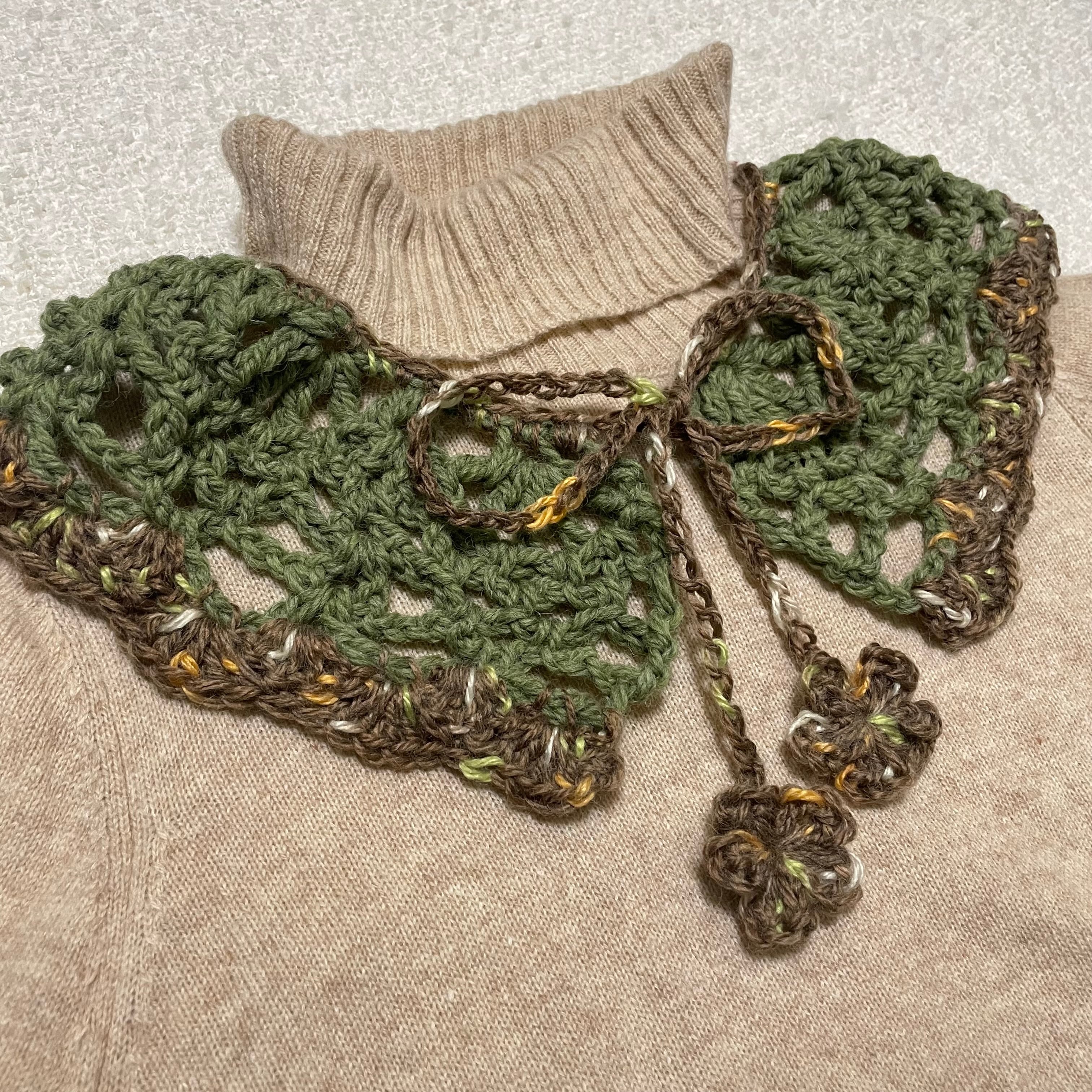 木の実のような色味とガーリーな雰囲気がとってもかわいい一点ものの手編みつけ襟です♡